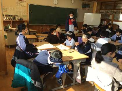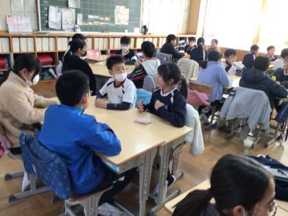 1/9 仲良く 5年生 公開日 2025/01/09 更新日 2025/01/09 各学年から 5年生の学活です。席替えをしたのち、グループでカードゲームをしてコミュニケーションをはかっていました。外来語を日本の言葉で説明するゲームを楽しそうにしていました。 5年