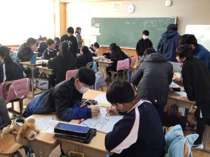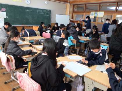6年生の算数の授業です。様々な量の単位の復習をしていました。体積がなぜ1000倍になるかの説明をグループで考えていました。