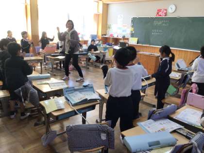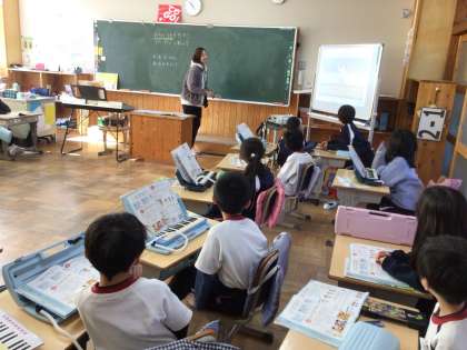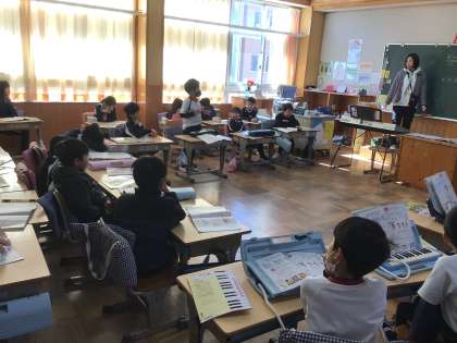 2年生の音楽の授業です。わらべうたとは何かを考えた後、「あんたがたどこさ」を歌いました。