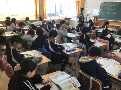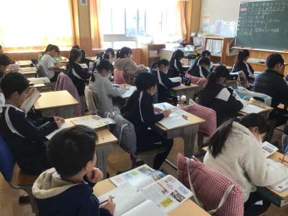 3年生の社会科の授業です。「事件事故からくらしをまもる」の学習で、地域での取り組みを発表しました。黒板を見ながらまとめをノートに書いていました。