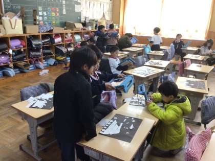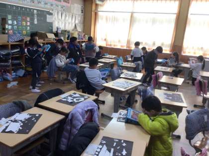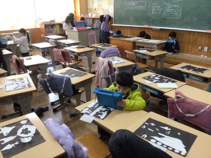2年生の図工の授業です。黒い画用紙に白い紙を切り貼りして作った作品を見合っていました。友達の作品の良いところを学習用タブレットに書き込んでいました。