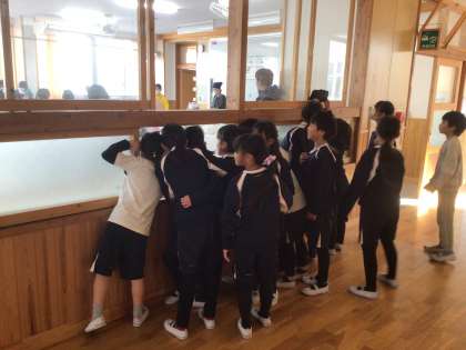 子どもたちが見学に来ました。興味津々に家庭科室を覗き込んでいました。「ありがとうございます」と口々にお礼を言いました。