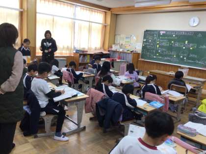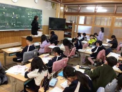 2年生の算数の授業です。メートルを使った長さの足し算を学習した後に、算数の友の練習問題に取り組みました。