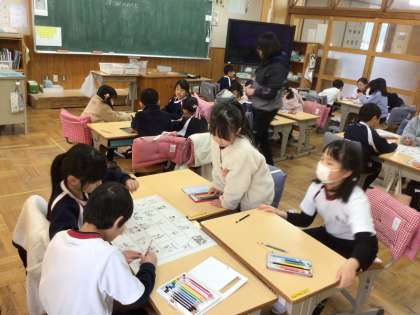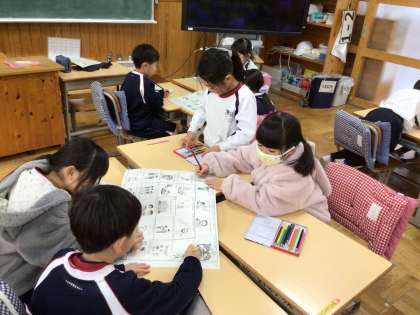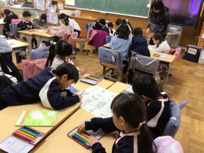 1年生の生活科の授業です。グループで協力してすごろくに色を塗っていました。何のすごろく?と見せてもらうと、1年間の学校生活についてのすごろくでした。「幼稚園の子達に小学校のことを教えてあげるの。」と教えてくれました。