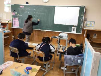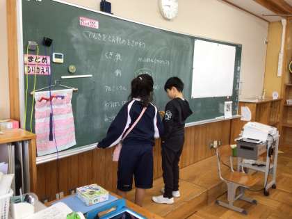 お日さま組、ひだまり組の理科の授業です。電気が通るかを調べて、黒板に印をつけていました。