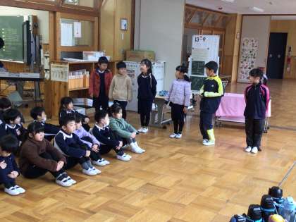 1年生の生活科の授業です。入学説明会の時に行う園児との交流について、リハーサルをしていました。担任が指示をしなくても、自分たちで進めていました。校歌も披露します。