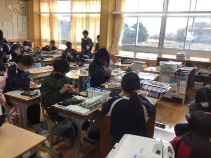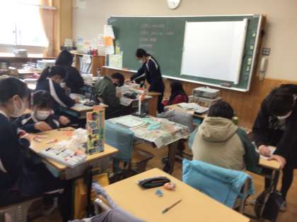 6年生の図工の授業です。針金に紙粘土で肉付けした人物に、着色をしていました。