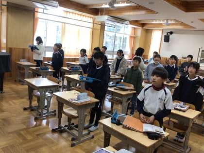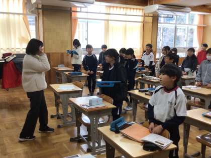4年生の音楽の授業です。「スマイル アゲイン」という合唱曲を美しい声で歌っていました。口角を上げて歌うように、笑顔を作って声を出す練習をしました。