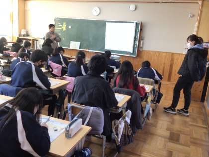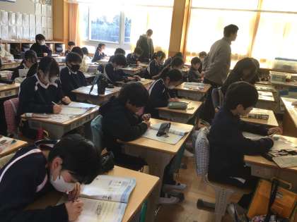 6年生の外国語の授業です。「私は理科クラブに入りたい。」「私は動物の保護活動をしたい。」など、したいことの英語のメモを読み、考えを書いているところです。