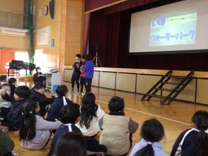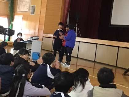 全校集会では、伊保川プロジェクトについての連絡と、感謝の会のリハーサルが行われました。伊保川のことで全校にアンケートを行い決めたことについて、4年生から報告がありました。「いぼウォーターパーク」と名づけ、副題を「はてなと学びの宝箱」としたことや、その理由について、楽しさいっぱいの発表をしました。