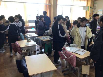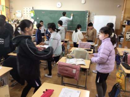 5年生の外国語の授業です。ALTが見本を見せながら英語で説明した、2人組になって行うゲームをしているところです。次々にいろいろな人と2人組になって行う必要があるので、積極的に相手を探します。