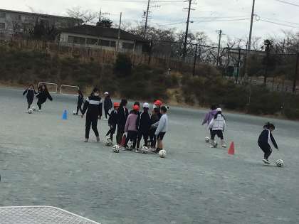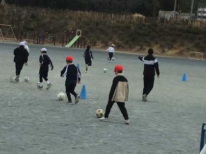 3年生の体育の授業です。サッカーのドリブルの練習をしていました。