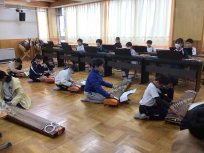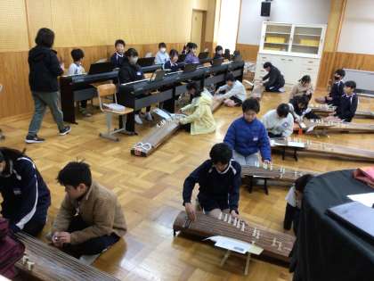 2/28 お琴体験 5年生 公開日 2025/02/28 更新日 2025/02/28 各学年から 5年生の音楽の授業です。日本の楽器を体験する学習で、お琴の体験をしていました。豊田市文化振興財団からお借りしたお琴を使わせていただいています。 5年