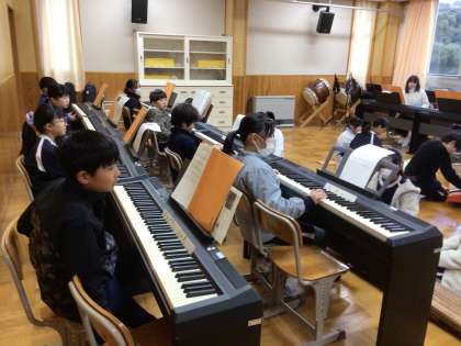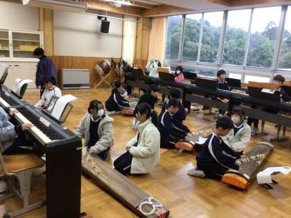 3/5 お琴体験 4年生 公開日 2025/03/05 更新日 2025/03/05 各学年から 4年生の音楽の授業です。豊田市文化振興財団からお借りしたお琴を活用し、5年生と同じくお琴の体験をしています。「さくら さくら」の途中まで演奏できていました。 4年