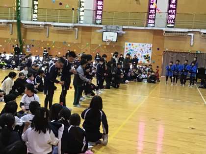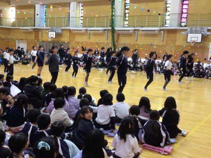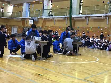 3/6 送る会 5、6年対決 公開日 2025/03/06 更新日 2025/03/06 学校行事 5年生と6年生の対決は、なわとび、けん玉、腕相撲の3種目でした。なわとびは途中で「あやとび10回入れて」などのミッションが入るものです。見応えのある対決を制したのは6年生でした。 行事
