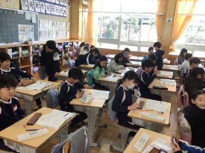3年生の算数の授業です。そろばんを使って計算をする学習です。そろばんにどのように数を置いて、どう動かして計算するのかを確かめながら計算をしていました。