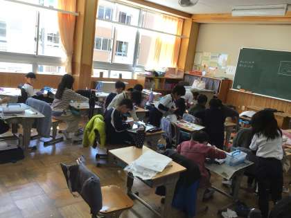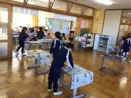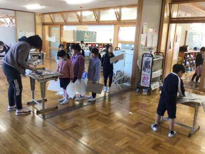 3/10 紙版画 2年生 公開日 2025/03/10 更新日 2025/03/10 各学年から 2年生の図工の授業です。紙版画の版を作り、できた子は刷る活動をしていました。オープンスペースを有効に活用して、広々したところで刷りました。 2年