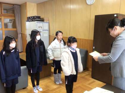 3/10 トゥルーハート賞 公開日 2025/03/11 更新日 2025/03/11 学校の特色ある活動 トゥルーハート賞の表彰を校長室で行っています。本校では、友達の良いところを見つける「まごころ発見カード」の取り組みをしていますが、その中からトゥルーハート賞を選び、表彰をしています。