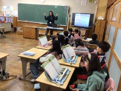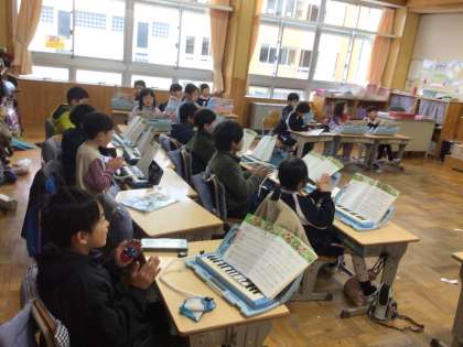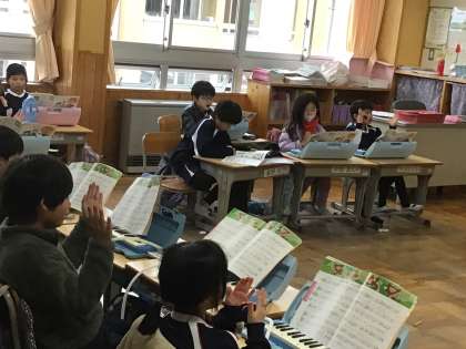 2年生の音楽の授業です。「アイアイ」の曲を歌いながら、リズム打ちを楽しそうにしていました。