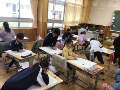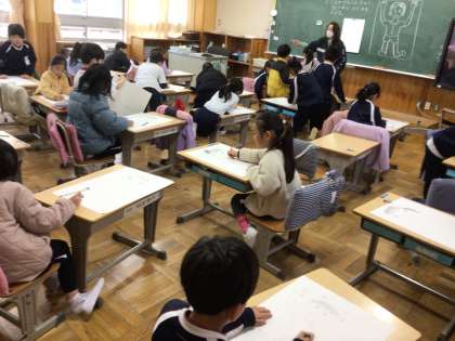 1年生の図工の授業です。大きな紙に、自分の全身を鉛筆で描いていました。両手か片足をあげるポーズで描きました。