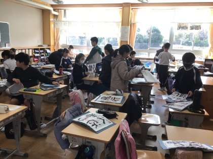 5年生が書写の学習やそれ以外の学習で取り組んだ作品をまとめていました。前に書いた自分の字と今の字を見比べたり、「懐かしいな。」と振り返ったりしながら、作品をまとめました。