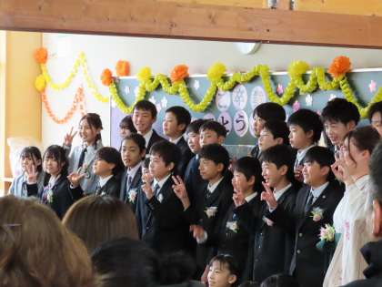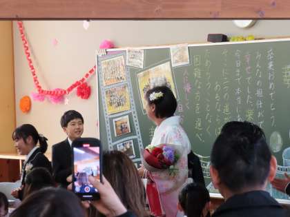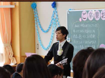 最後の学級活動です。保護者が見守る中、担任や友達と別れを惜しみました。