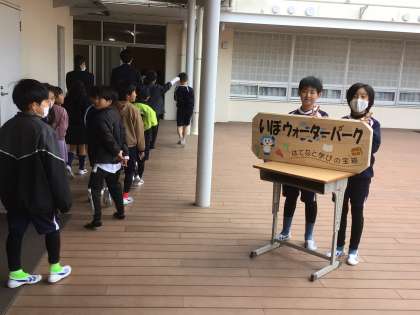 3/24 看板お披露目 公開日 2025/03/24 更新日 2025/03/24 学校行事 修了式の後、4年生からの連絡がありました。学校周辺の伊保川を「伊保ウォーターパーク」と名付けましたが、その看板ができたので、お披露目をしたのです。里山づくりの会の方に作っていただいた看板に、子どもが絵を描きました。ニスを塗って完成したら、まごころの森の川の入り口に設置します。 4年