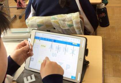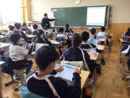 6年生算数科の授業の様子です。身のまわりの整った形の特徴に気づき、対称性について調べていくという単元です。今日は、切り取った形を折ったり回したりしたときに重なるかどうかについて実際に調べ、仲間分けをしていました。