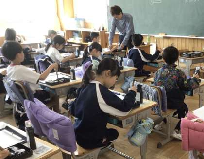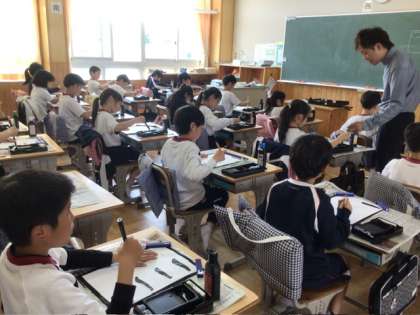 3年生の書写の授業の様子です。初めての習字の授業でした。講師の先生をお招きし、道具の名前や置き方、筆や墨の扱い方など、丁寧に教えていただきました。子どもたちは話をよく聞き、集中して取り組んでいました。