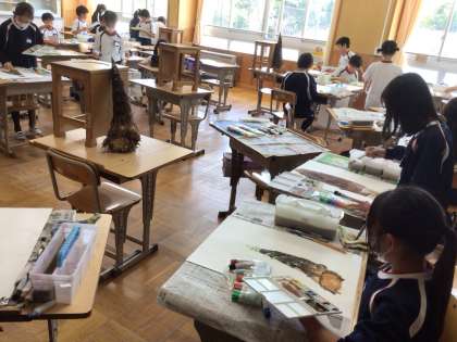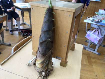 5年生図画工作科の学習の様子です。本物の大きなたけのこを、色や皮の様子など、よく観察して描いていました。