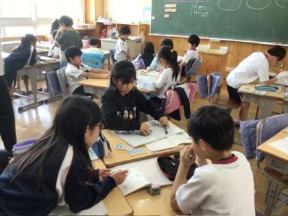 3年生算数科「わりざん」の授業の様子です。「12個あめを3人に分けると1人何個になるか」数図ブロックで確かめながら学習をしていました。