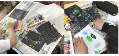 3年生図画工作科「かいて見つける わたしのすきなもの」の学習の様子です。クレヨンを使って、描きながら自分の好きなものを見つけ楽しそうに表現していました。