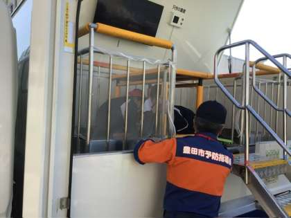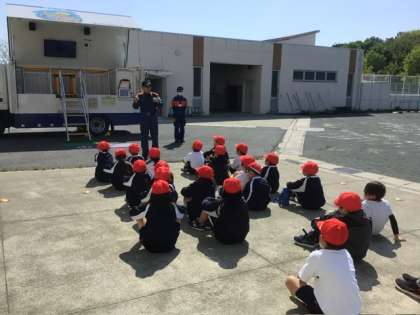 3,4年生が、地震体験車(防サイ君)による地震体験を行いました。前後、上下、左右に揺れ、震度7までの地震を体験しました。指導員の方から「頭と首を守ることが大切」と教えていただき、机の脚をしっかり持ち、頭を机の中に入れる体験をしました。