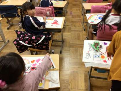 図画工作科の授業の様子です。「すきなものを かみいっぱいにかこう」の単元です。自分の好きなものを思い浮かべ、画用紙いっぱいに描いていました。