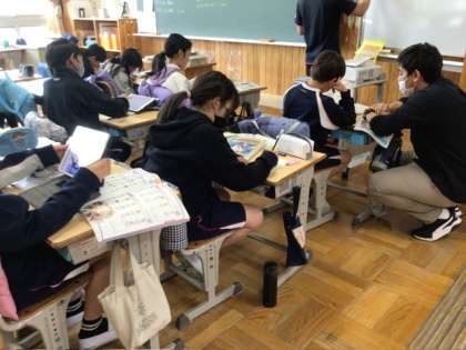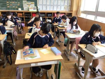 外国語科の学習の様子です。自分の好きなものなどを「名刺カード」に書いていました。わからない単語は、辞書代わりの教科書を見て、記入していました。この後、ペアで伝え合います。