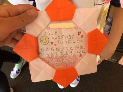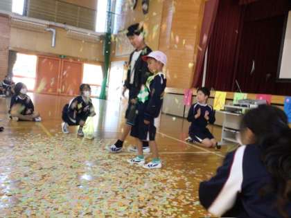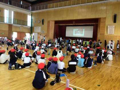 6年生の企画運営による「1年生を迎える会」を行いました。会は二部制で、前半は体育館で全校一緒に、後半は各教室に分かれ、わくわく班で活動をしました。