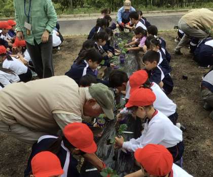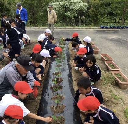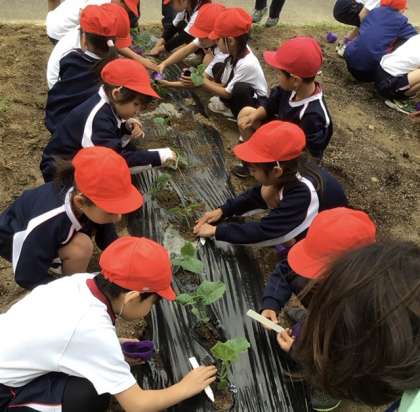 2年生が生活科で野菜の苗を植えました。畑ボランティアの皆さんが、畝の準備と当日の指導もしてくださいました。苗は、ピーマン、ナス、キュウリの中で自分で育てたいものを選びました。観察をしながら、成長や収穫を楽しんでいってほしいです。