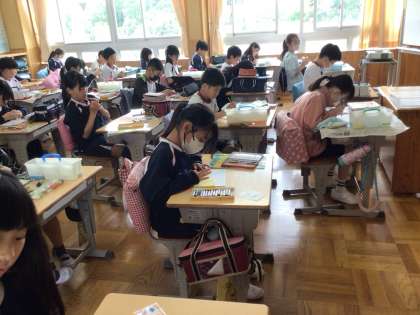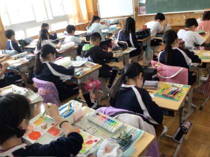 5年生図画工作科の学習の様子です。自分の心の様子を絵で表現しようという単元です。色や形を工夫しながら、集中して作品作りをしていました。