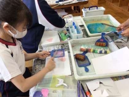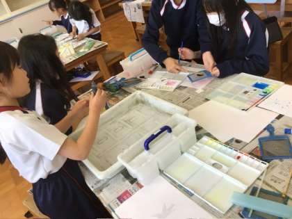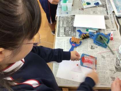 4年生図画工作科「絵の具でゆめもよう」の学習の様子です。道具や技を使って、いろいろな模様をつくっていました。絵の具を歯ブラシなどにつけて、紙の上で金あみをこすっているのは、「スパッタリング」という表し方です。こすり方を考えながら、表現を楽しんでいました。