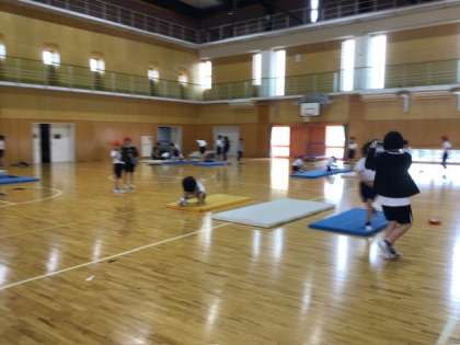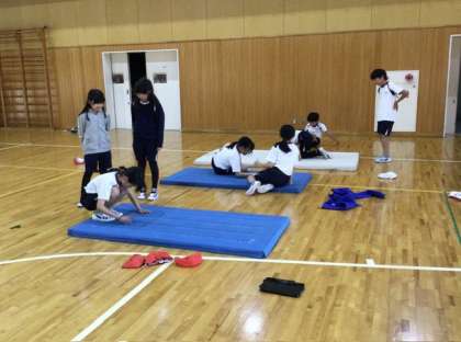 体育科「マット運動」の学習の様子です。友達と互いに技の様子を撮影しながら動画を確認し、改善点を考えつつ練習を重ねていました