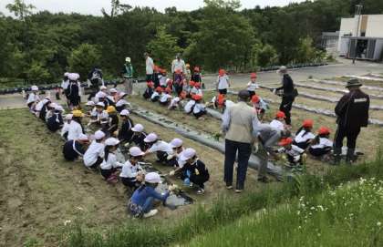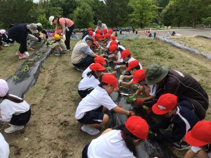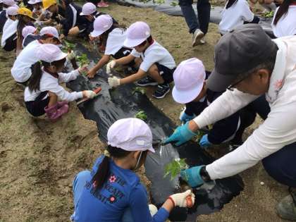 1年生の子どもたちがサツマイモの苗を植える体験を行いました。この活動では、畑ボランティアの皆さんが事前に植え付けの準備を整えてくださいました。そのおかげで、子どもたちは教えていただきながら、一人ひとりが1本ずつ苗を植える貴重な経験ができました。今後の成長が楽しみです。