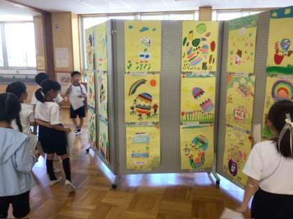 図画工作科では、子どもたちがそれぞれの作品をじっくり鑑賞していました。「色が素敵だね」「卵から飛び出したものが面白い」といった声が飛び交い、お互いの工夫を見つけて楽しそうに活動していました。