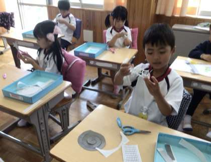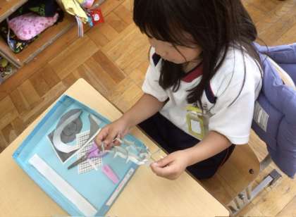 図画工作科「ちょきちょきかざり」の学習の様子です。紙を折り、向きを変えて「あっち行ったりこっち行ったり切るんだよ」と楽しそうに教えてくれました。安全にも気を配りながら、はさみを使っています。