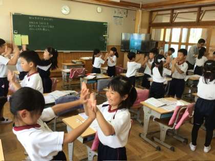 音楽に合わせて、子どもたちは3拍子の手遊びを楽しんでいました。一人で、またはペアで繰り返し練習をする中で、拍のまとまりやリズムを感じ取っているようです。