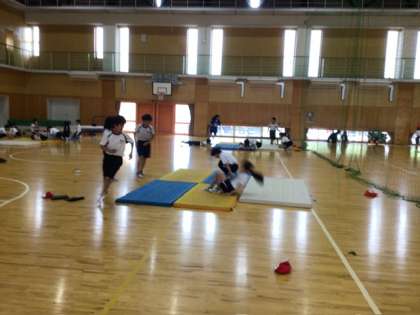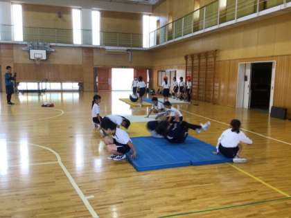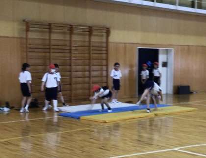 体育の授業では、子どもたちがグループで話し合いながらマット運動に取り組んでいました。グループで考えた技を組み合わせながら練習を進め、学習用タブレットで撮影した映像から自分たちの動きを振り返ることで、より良いパフォーマンスを目指して工夫していました。