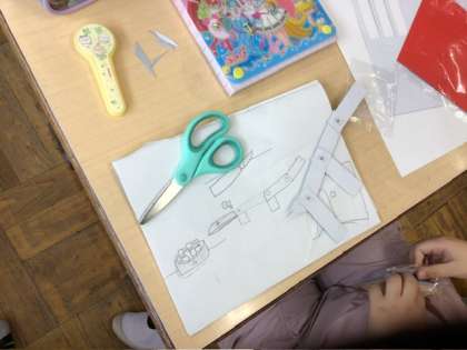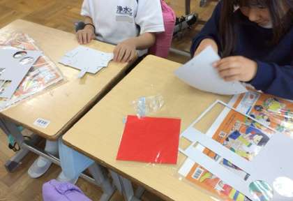 図画工作科「うごいて楽しいわりピンワールド」の学習の様子です。割りピンを使った仕組みを動かしながら表現したいことを考えていました。