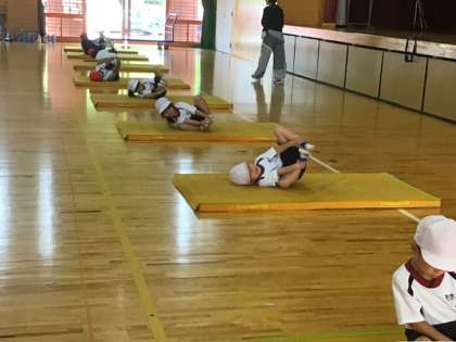 体育の時間に「マットあそび」を行いました。マットの上に座り、前後や左右に体を揺らすなど、さまざまな動きを順番を守りながら取り組みました。