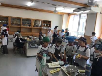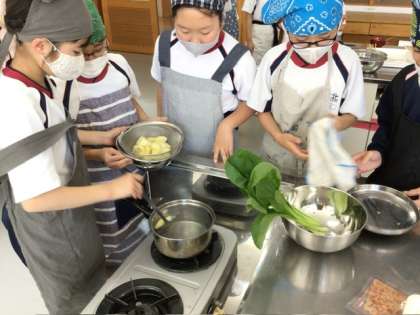 家庭科の授業で調理実習を行い、「ゆでる調理」に挑戦しました。小松菜とジャガイモを使った調理では、調理器具の安全な扱いに気を付けながら進めました。調理後はお手製のソースを作り、試食を通して料理の楽しさを感じることができたようです。