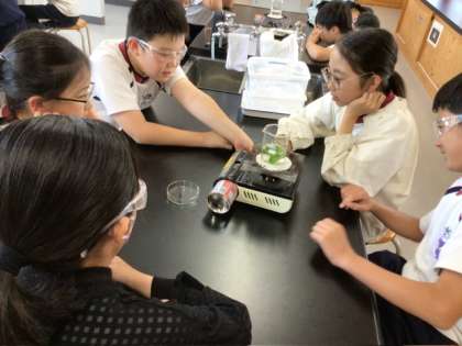 理科の授業で、前日アルミホイルをかぶせたジャガイモの葉を使い、デンプンの生成を調べる実験を行っている学級がありました。安全に注意しながら進め、ヨウ素液の反応を観察し結果をまとめました。この活動を通じて、子どもたちは光合成の仕組みを学んでいます。