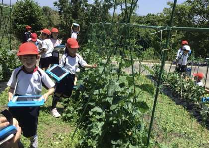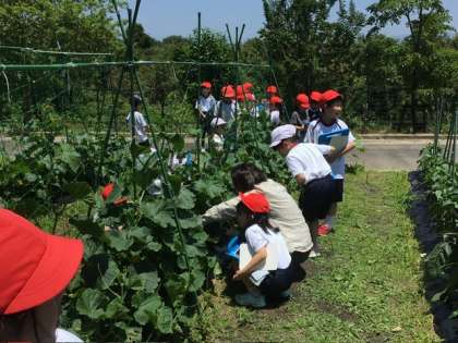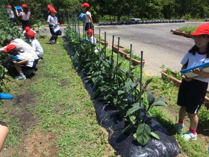 生活科の活動で育てている夏野菜の観察を行いました。大きく、おいしそうなピーマンを収穫する子の姿も見られました。畑ボランティアの皆さんには、2年生の子どもたちだけでは難しい支柱建てをはじめとするさまざまな作業をしていただいています。皆様、ありがとうございます。